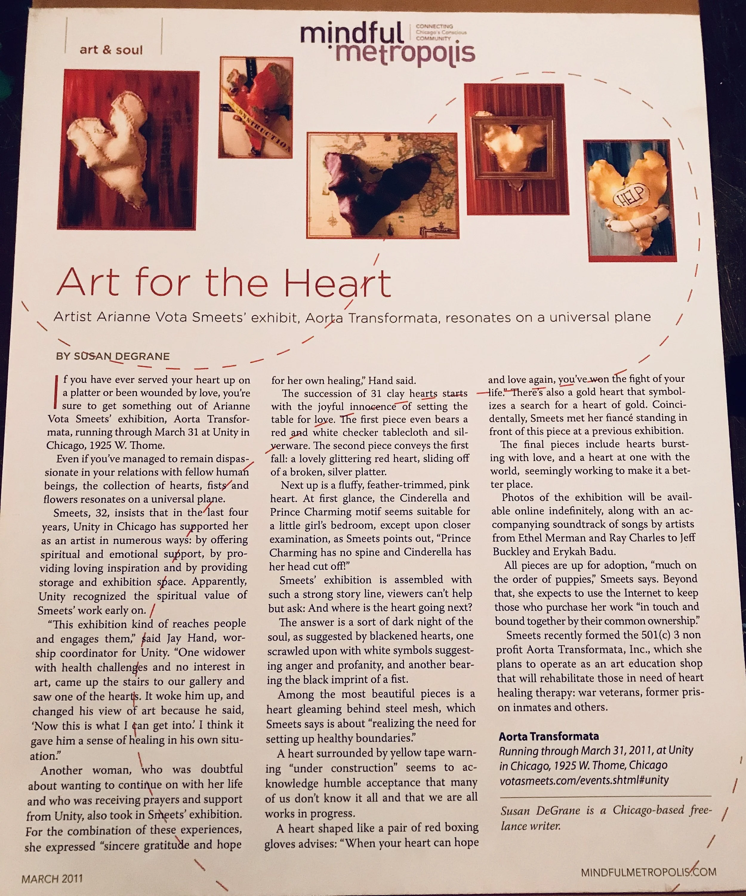 Chicago’s Mindful Metropolis March 2011 reviewed “Art for the Heart: Artist Arianne Vota Smeets’ exhibit, Aorta Transformata, resonates on a universal plane” with featured one page article is its Art & Soul section.